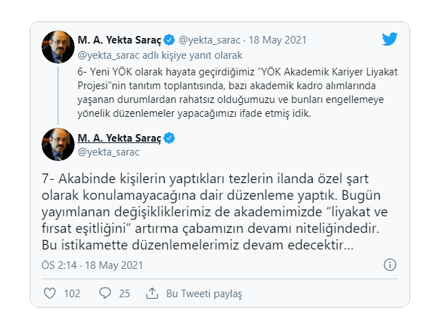 Yeni YÖK olarak hayata geçirdiğimiz 'YÖK Akademik Kariyer Liyakat Projesi'nin tanıtım toplantısında, bazı akademik kadro alımlarında yaşanan durumlardan rahatsız olduğumuzu ve bunları engellemeye yönelik düzenlemeler yapacağımızı ifade etmiş idik" diyen Saraç, devamında "Akabinde kişilerin yaptıkları tezlerin ilanda özel şart olarak konulamayacağına dair düzenleme yaptık. Bugün yayımlanan değişikliklerimiz de akademimizde 'liyakat ve fırsat eşitliğini' artırma çabamızın devamı niteliğindedir. Bu istikamette düzenlemelerimiz devam edecektir.