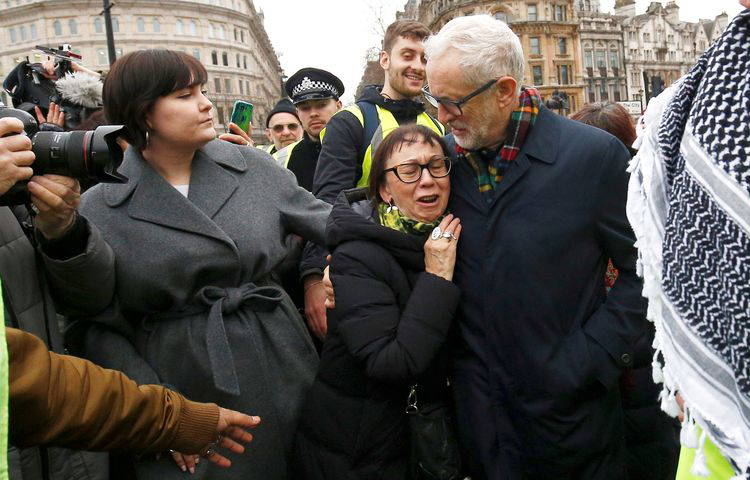 İşçi Partisi lideri Jeremy Corbyn, 11 Ocak 2020'de Londra'nın merkezindeki Trafalgar Meydanı'nda İran'a savaş tehdidine karşı yapılan bir gösteride.