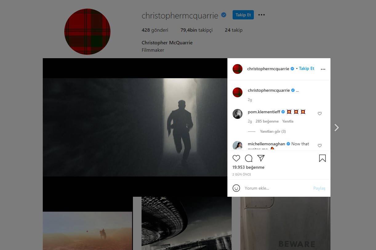 NTV'nin aktardığı habere göre, sosyal medyada daha önce çekimler sırasında setlerin yakınlarında olan kişiler tarafından çekilen görüntüler filmin zorlu aksiyon sahnelerine dair ipuçları vermişti. McQuarrie'nin paylaştığı fotoğraftaysa karaltı biçimindeki Tom Cruise'un dar bir koridorda koştuğu görülüyor.