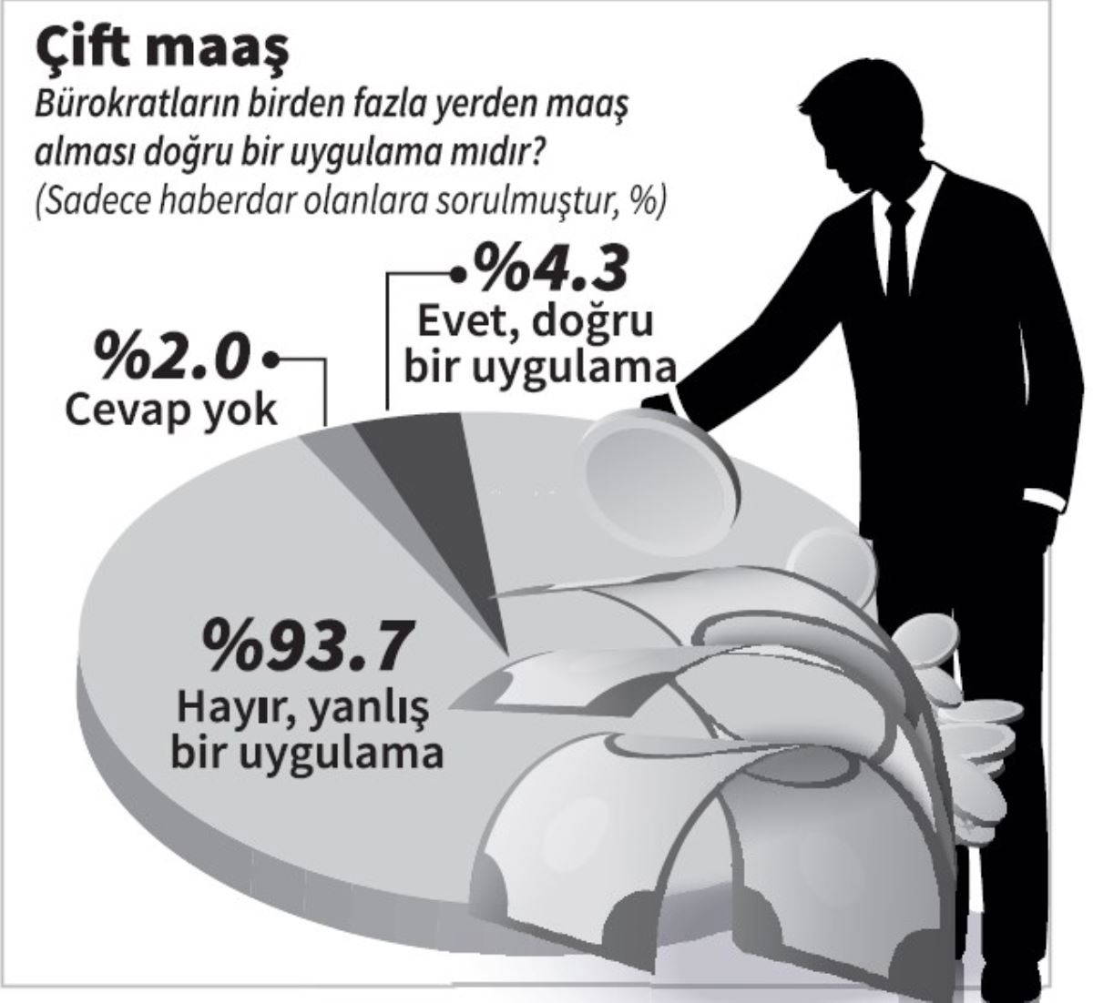 Yöneylem’in araştırmasına göre, halkın yüzde 93.7’si çift maaşlı bürokratlara karşı. Yöneylem Sorumlu Genel Koordinatörü Siyaset Bilimci Doç. Dr. Derya Kömürcü, oranın normalde karşılaşmadıkları derecede yüksek olduğunu belirterek “Demek ki seçmen çok bariz bir yanlışlık olarak algılıyor” yorumunda bulundu. Kömürcü, ayrıca “Çift maaş konusu 128 milyar dolar konusunda olduğu gibi muhalefetin ülke gündemini belirleyebileceği bir potansiyele işaret ediyor” dedi.