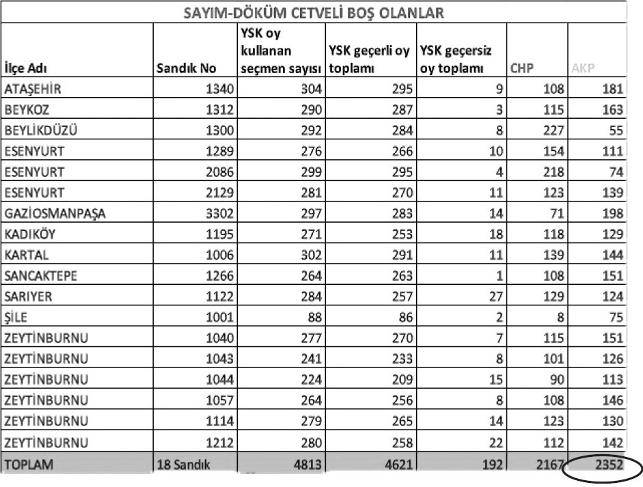 “Söz konusu 90 sandığın sandık sonuç tutanakları ile sayım döküm cetvellerinin karşılaştırılması sonucunda, 86 sandıkta partilerin ve bağımsız adayların aldıkları oy sayılarının sayım döküm cetvellerindeki oy sayıları ile aynı olduğu, sadece 4 sandığın birinde yalnızca Ak Parti’nin oylarının 1 oy fazla (Bağcılar 4002 nolu sandık), iki sandıkta 2 oy fazla (Fatih 1119 numaralı sandık ve Adalar 1029 numaralı sandık), bir sandıkta da 4 oy fazla (Bağcılar 1069 numaralı sandık) yazıldığı, diğer partilerin ve bağımsız adayların oy sayılarının ise sayım döküm cetvellerindeki sayılarla aynı olduğu görülmektedir. Bu tespite göre, anılan sandıklarda sayım döküm cetvellerinin tutulduğu, oyların tespitinin yapıldığı ve sandık sonuç tutanaklarına geçirildiği, ancak aynı zaman diliminde bir arada bulunan ve sandık sonuç tutanağını itiraz şerhi koymaksızın imzalayarak hep birlikte sandık sonucunu teyit ve doğruluğunu taahhüt eden sandık kurulu üyelerinin, sayım döküm cetvellerini imzalamayı ihmal ettiği anlaşılmaktadır.”
