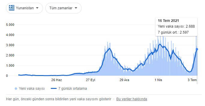 Yunan medyasındaki haberlerde, ülkede son bir ayda günlük vaka sayılarının 10 katına çıktığı, en yüksek artış oranlarının Atina, Selanik, Yanya, Grevena bölgelerinde ve Girit Adası başta olmak üzere bazı Ege adalarında tespit edildiği bildirildi.
