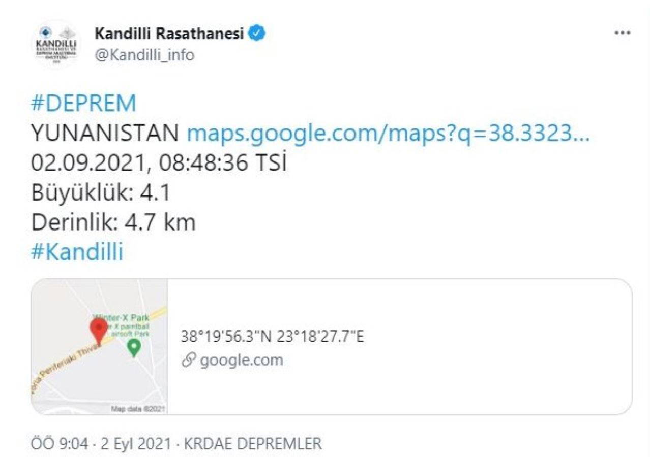 Kandilli Rasathanesi'nden yapılan açıklamaya göre, Yunanistan'ın Tebai bölgesinde saat 08.48 sıralarında bir deprem meydana geldi.