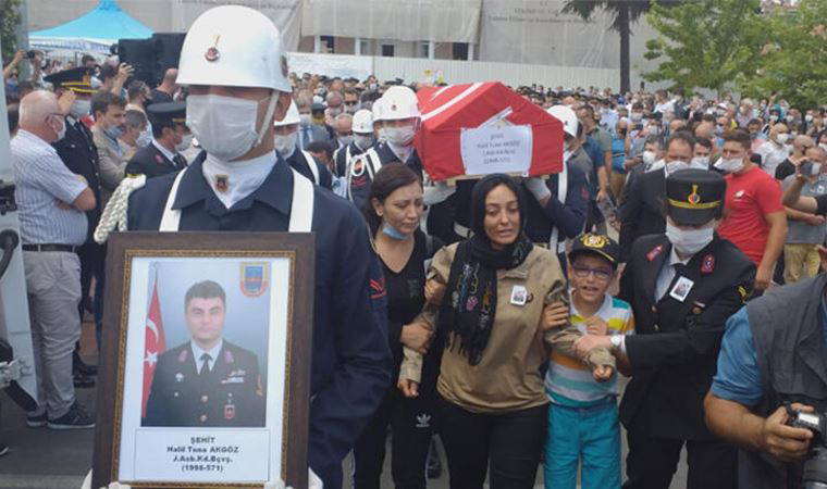 Törende, şehidin babası ve asker kıyafeti giyen eşi ile çocukları 14 yaşındaki Basri ve 9 yaşındaki Alper Akgöz, tabutun önünde bulunan şehidin fotoğrafına sarılarak gözyaşı döktü.
