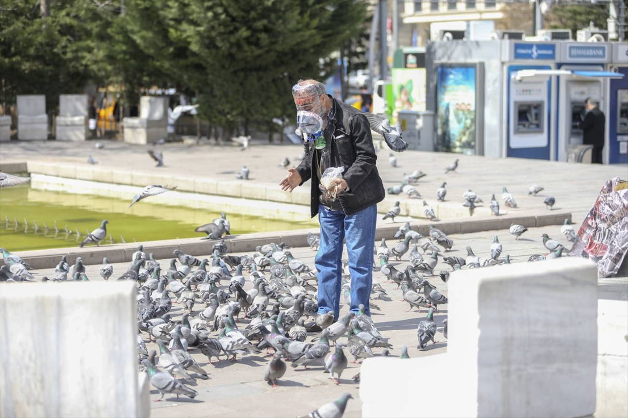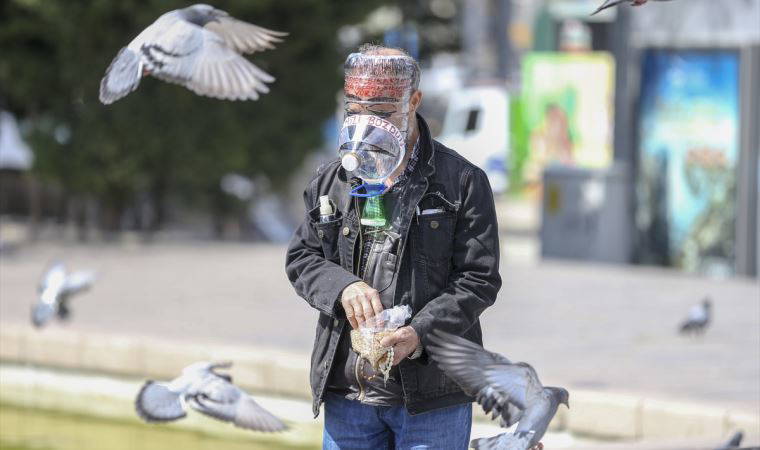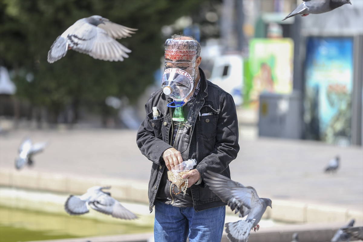 yurttaş pet şişelerden yaptığı maskeyle kuşlara yem verdi.