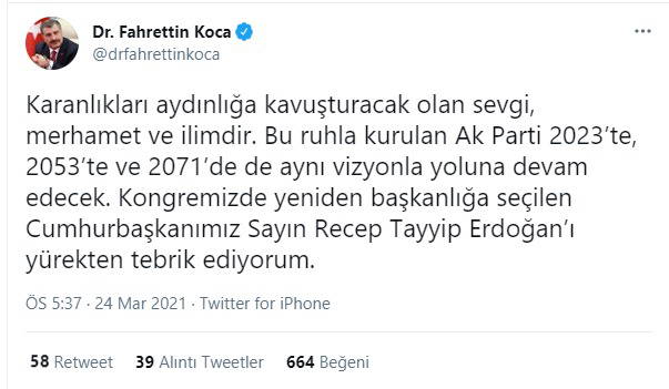 "Bu ruhla kurulan Ak Parti 2023’te, 2053’te ve 2071’de de aynı vizyonla yoluna devam edecek" diyen Koca yeniden genel başkan seçilen Erdoğan'ı da tebrik etti.
