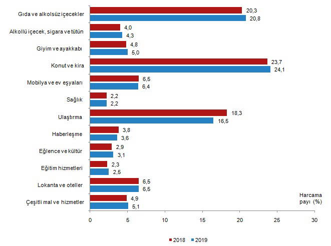 Hanehalkı bütçe araştırmasının 2019 yılı sonuçlarına göre Türkiye genelinde hanehalklarının tüketim amaçlı yaptığı harcamalar içinde en yüksek payı yüzde 24,1 ile konut ve kira harcamaları alırken, ikinci sırayı yüzde 20,8 ile gıda ve alkolsüz içecek harcamaları, üçüncü sırayı ise yüzde 16,5 ile ulaştırma harcamaları aldı.