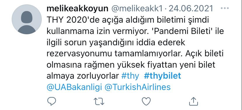 THY'de yaşanan 'açık bilet' krizine yönelik sosyal medya kullanıcılarından çok sayıda tepki geldi. THY'den satın aldıkları ve kısıtlamalar nedeniyle açığa aldıkları biletlerini yeniden kullanamadıklarını belirten yurttaşlar, yaşadıkları mağduriyetin giderilmesi için firmaya sosyal medya üzerinden çağrı yaptı.