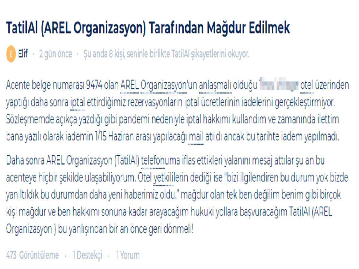 "Kemal: 3 Mart'ta 21- 28 Haziran'da kullanılmak üzere 1 haftalık tatil satın aldık. Hiçbir tatil sitesi, acente ya da farklı bir şirket olmaksızın doğrudan otelle görüştük ve ücretini Arel Org. diye bir acentanın hesabına yatırmamızı istediler. Belirtilen ücreti yatırdıktan bir süre sonra istediğimiz tarihlerde otelin açık olmayacağı ve dilersek başka bir tarih dilersek de iptal seçeneği kullanabileceğimiz söylendi. İptal istedik ve temmuz başında ödediğimiz ücretin iadesinin yapılacağı belirtildi. Temmuz başına geldiğimizde ise hiç muhatap olmadığımız Arel isimli acenteden iflas ettiğine dair bir SMS aldım. Yaklaşık 1 haftadan beri otelin ödediğim ücreti iade etmesi için yüzlerce dakikalık telefon görüşmelerim hep sonuçsuz kaldı.