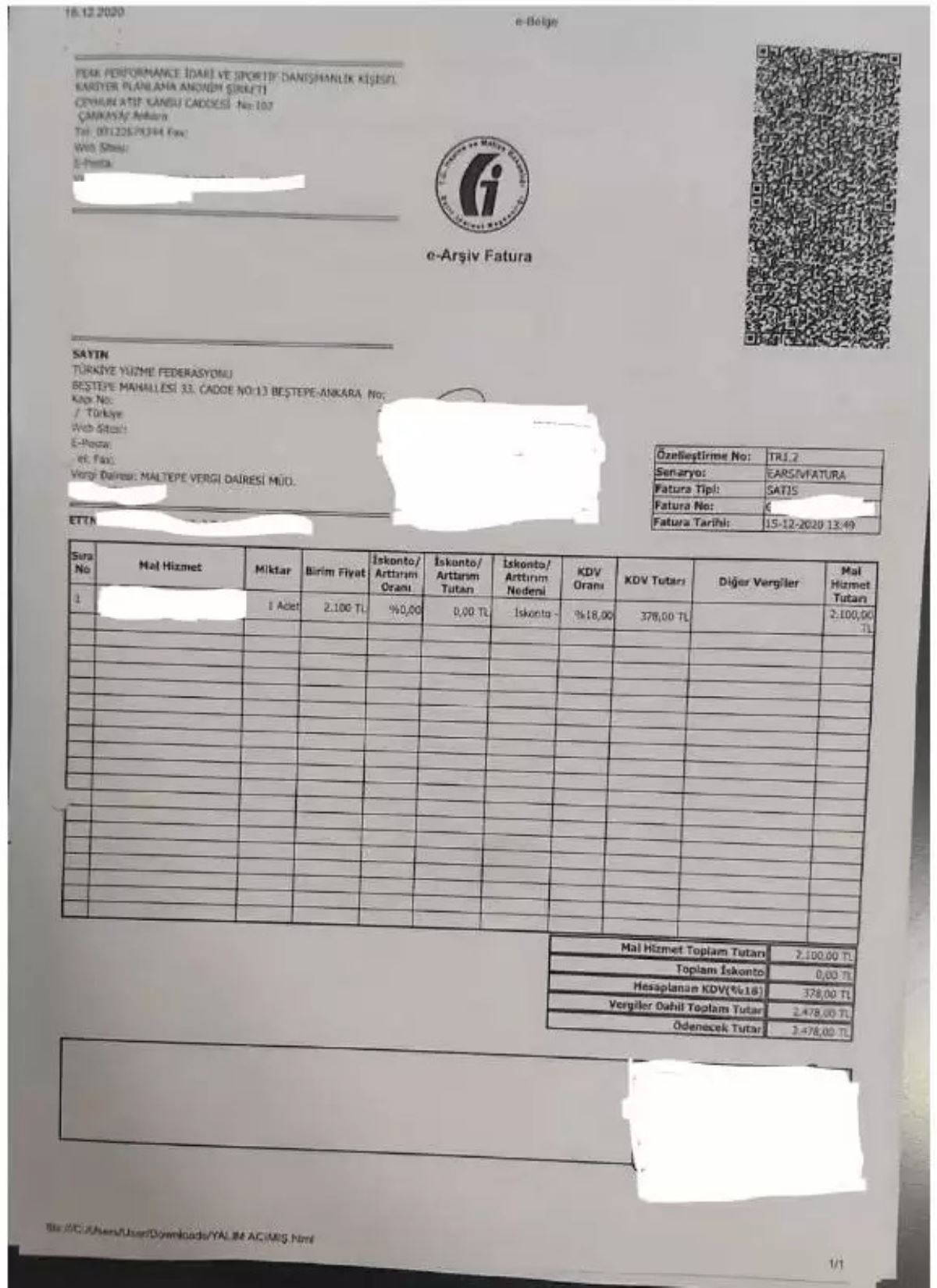 Haberin içindeki yer alan detaya göre, Peak Performance şirketi Tokyo 2020 Olimpiyat Oyunları destek programı dahilinde, Olimipiyat hazırlık ve destek proje kriterlerini yerine getirip kadroda bulunmaya hak kazanan bir çok sporcuya Federasyon ile sözleşmesi olan Peak Performance, danışmanlık yapıyor. Kasım 2020 dönemi için 54 bin 516 liralık hizmet faturası Peak Performance tarafından Türkiye Yüzme Federasyonu'na fatura edildi ve danışmanlık ücreti olarak Federasyon tarafından ücreti ödendi.