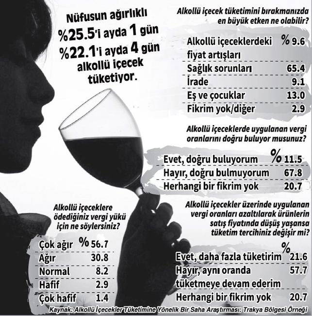 “Trakya Bölgesi Örneği” araştırmasına göre, yurttaşların yüzde 84’ü alkol üzerindeki vergi sisteminin adaletsiz olduğunu düşünüyor. Katılımcıların yüzde 57.7’si alkollü içeceklerde vergi oranının azaltılması durumunda tüketim tercihinin ve oranının değişmeyeceğini, yüzde 21.6’sı daha fazla tüketeceğini, yüzde 20.7’si ise herhangi bir fikrinin olmadığını belirtiyor. Araştırmada şu tespitlere yer verildi: