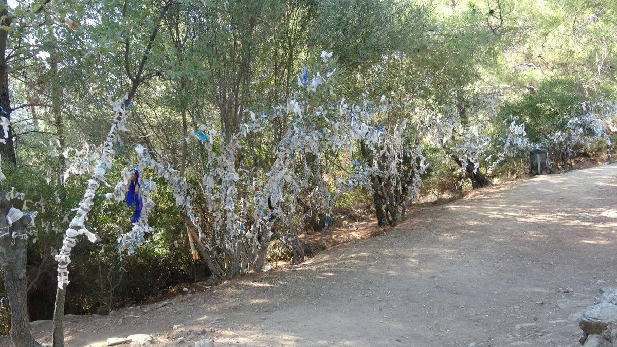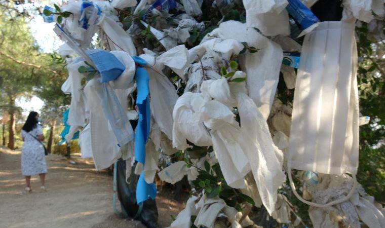 Yunan mitolojisinde önemli yeri olan Zeus Sunağı çevresindeki ağaçlar, bu yıl ise cerrahi maskelerle doldu. Ziyaretçiler, koronavirüs salgını nedeniyle kullanımı zorunlu hale getirilen maskeleri dilek dileyerek, ağaçlara bağlıyor.