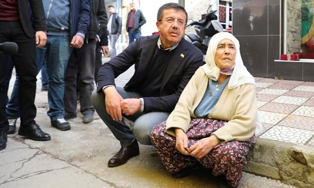 İzmir’in Tire ilçesini ziyaret eden Zeybekci, yolda yürürken kaldırımda oturan yaşlı bir teyzenin yanına gitti.Teyzenin yanına oturan ve adını öğrenen Zeybekci, kaldırımda niye oturduğunu sordu. Yaşlı kadın tüp beklediğini söyledi.