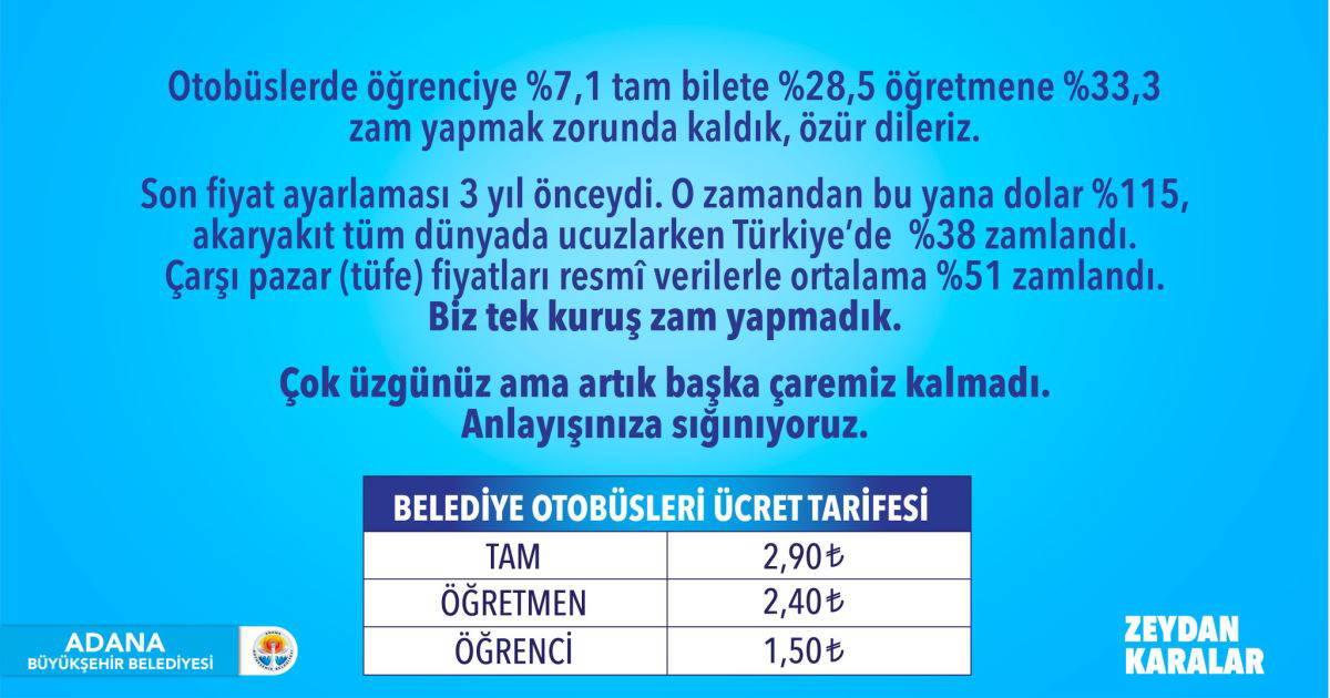 Twitter’dan bir paylaşım yapan Karalar, “Çarşı pazar (tüfe) fiyatları resmi verilerle ortalama yüzde 51 zamlandı. Biz tek kuruş zam yapmadık. Çok üzgünüz ama artık başka çaremiz kalmadı. Anlayışınıza sığınıyoruz” ifadelerine yer verdi.