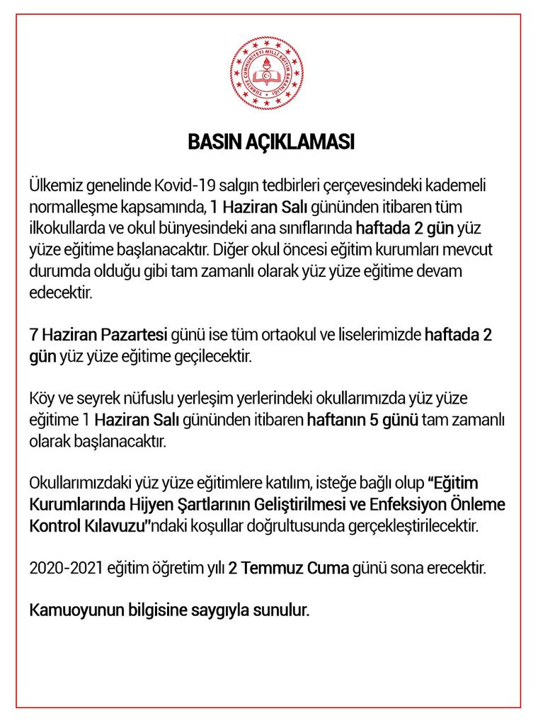 Yarın itibariyle ilkokul öğrencilerimiz, 7 Haziran Pazartesi’den itibaren ise ortaokul ve lise öğrencilerimiz için haftada iki gün yüz yüze eğitime başlıyoruz. pic.twitter.com/MENeseU14K
