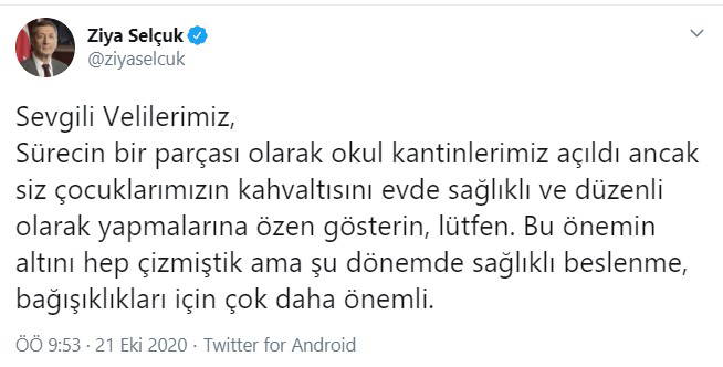 “Sevgili Velilerimiz, Sürecin bir parçası olarak okul kantinlerimiz açıldı ancak siz çocuklarımızın kahvaltısını evde sağlıklı ve düzenli olarak yapmalarına özen gösterin, lütfen. Bu önemin altını hep çizmiştik ama şu dönemde sağlıklı beslenme, bağışıklıkları için çok daha önemli.”