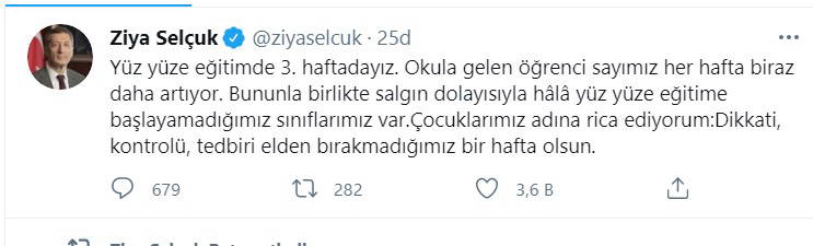 Selçuk, ''Yüz yüze eğitimde 3. haftadayız. Okula gelen öğrenci sayımız her hafta biraz daha artıyor. Bununla birlikte salgın dolayısıyla hâlâ yüz yüze eğitime başlayamadığımız sınıflarımız var. Çocuklarımız adına rica ediyorum: Dikkati, kontrolü, tedbiri elden bırakmadığımız bir hafta olsun'' ifadelerini kullandı.