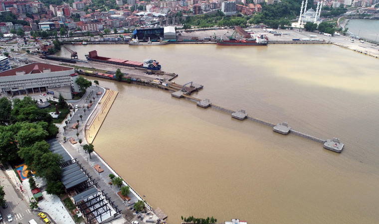Derelerden gelen suyla birlikte liman içi ve deniz, çamur rengine boyandı. Limanda oluşan kirlilik, dronla havadan görüntülendi.
