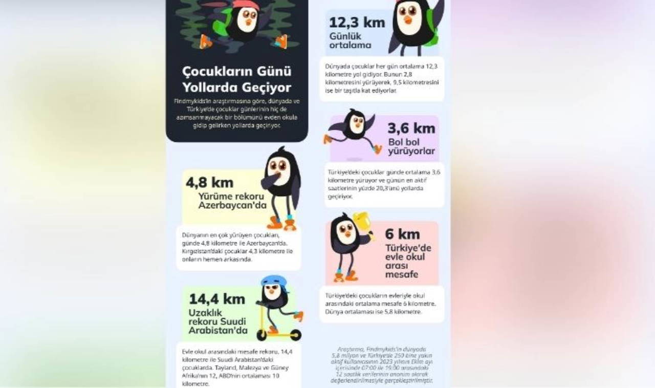 Findmykids verilerine göre dünyadaki çocuklar her gün ortalama 12,3 kilometre yol gidiyor. Bunun 2,8 kilometresini yürüyerek, 9,5 kilometresini ise bir taşıtla kat ediyorlar. Araştırmaya göre dünyanın günde en çok yürüyen çocukları Azerbaycan’da. Findmykids araştırması Azerbaycan’daki çocukların günde ortalama 4,8 kilometre, Kırgızistan’dakilerin 4,3 kilometre, Hindistan’dakilerin 3,8 kilometre ve Türkiye’deki çocukların ise günde ortalama 3,6 kilometre yürüdüğünü ortaya koyuyor. Almanya ve Rusya’nın ortalaması 2,6 kilometre, İngiltere’nin ortalaması 2,2 kilometre ve çocukların en az yürüdüğü ülke olan ABD’nin ortalaması ise 1,6 kilometreyle Türkiye’nin yarısından az.