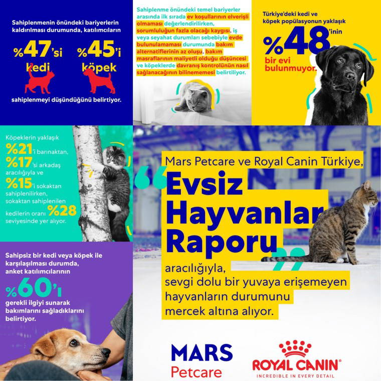 Kedi ve köpeklerin beslenme ihtiyaçlarına yönelik geliştirdiği ROYAL CANIN®, PEDIGREE®, PERFECT FIT™, WHISKAS® ve SHEBA® portföyü ile hayvanların sağlıklı yaşam sürmelerini amaçlayan Mars Petcare, dünya çapında evsiz hayvan popülasyon dinamiklerini anlayabilmek, sahiplenmenin önündeki bariyerleri tespit edebilmek ve çözümün geliştirilmesine katkıda bulunabilmek amacıyla kapsamlı bir rapor yayınladı. Türkiye’ye ilişkin veriler, evsiz hayvan sayısı, kısırlaştırma oranları, hayvan sahiplenme alışkanlıkları ve hayvan sahiplerinin görüşlerine dair önemli bulgular ortaya koyuyor.