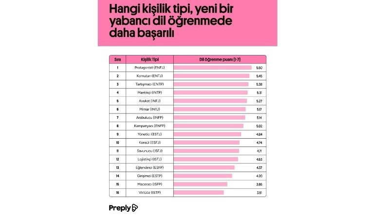 Tüm dünyada yaygın olarak kabul edilen, Türkiye’de en az 8 milyon kez çözüldüğü bilinen Myers-Briggs Kişilik Tipi Göstergesi’nin (MBTI) referans alındığı araştırma, şeffaf bir metodolojiyle kişilik tiplerinin öğrenmeye etkisini puanladı ve kişilik tipleri, dil öğrenmedeki başarılarına göre sıralandı. Bireyleri içe dönüklük / dışa dönüklük, duyumsama / sezme, düşünme / hissetme ve yargıya varma / algılama tercihleri üzerinden değerlendiren testi çözen 1.000 Preply online İngilizce kursu öğrencisine çeşitli sorular yöneltildi. Anket sonuçları, Protagonist / Önder (ENFJ), Buyurucu / Komutan (ENTJ) ve Tartışmacı (ENTP) kişilik tipine sahip olanların, dil öğrenmede en başarılı olanlar olduğunu gösterdi.