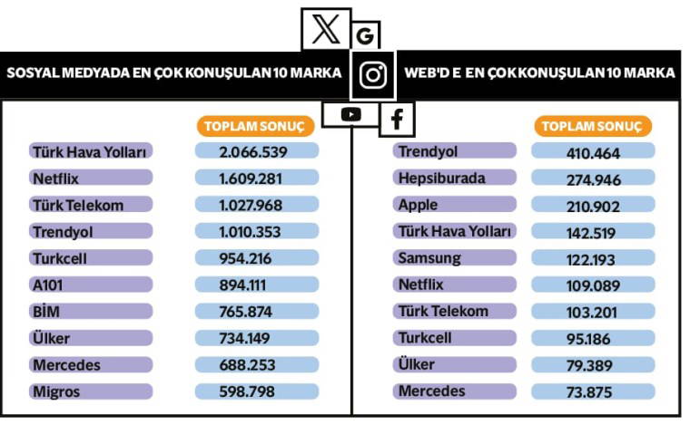 2023 yılında sosyal medyanın kullanım düzeyinin arttığı gözlenirken sosyal medyada en çok konuşulan markalar sırasıyla Türk Hava Yolları, Netflix ve Türk Telekom oldu. Webde ise e-ticaret platformları öne çıktı. Webde en çok konuşulan markalar sıralamasında Trendyol, Hepsiburada ve Apple ilk üçte kendine yer buldu.
