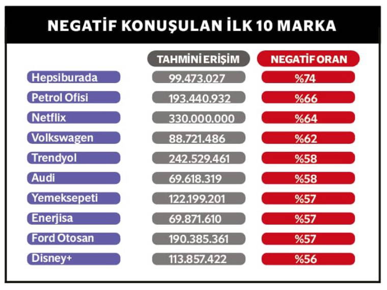 DİR100-2023 listesine baktığımızda markalarla ilgili dijital mecrada genellikle negatif konuşmaların ağırlıkta olduğu görüldü. Negatif yönde en çok konuşulan markalar sıralamasında ilk üçte Hepsiburada, Petrol Ofisi, Netflix yer aldı. Pozitif konuşulma oranı en yüksek ilk üç marka ise Nescafe, Bridgestone ve Dimes oldu.