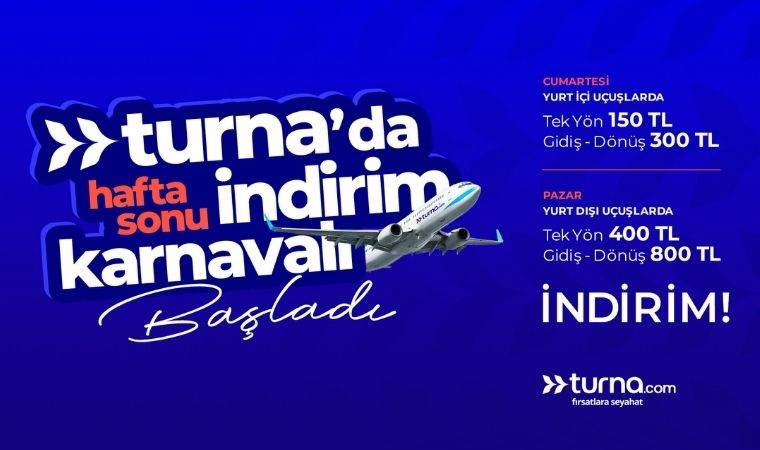 Uçak, otobüs ve feribot gibi farklı seyahat araçlarını tek çatı altında toplayan Turna.com, Eylül ayını yeni bir indirim kampanyasıyla kapatıyor. Hafta Sonu İndirim Karnavalı ile hem uçak biletlerinde hem yurt içi hem de yurt dışı yolcuları 150 TL’den 800’TL’ye kadar indirimli uçabilecek.