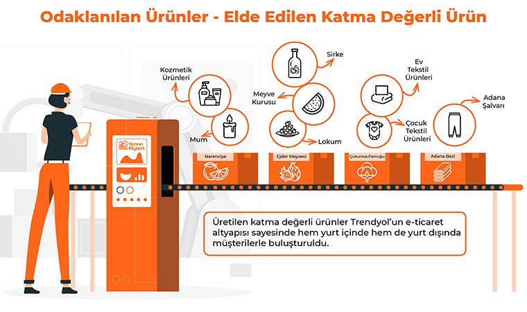 Dijital merkezde, yöresel ürünlerin katma değerli hale gelmesi amacıyla ürün geliştirme atölyeleri düzenlendi. Böylece, Yarının Köyleri projesinin yol haritasında belirlenmiş odak ürünler, merkezde katma değerli ürünlere dönüştürüldü. Narenciyeden mum ve kozmetik ürünleri, ejder meyvesinden lokum, meyve kurusu ve sirke, Çukurova pamuğundan çocuk ve ev tekstil ürünleri üretilerek Trendyol’un e-ticaret altyapısı sayesinde hem yurt içinde hem de yurt dışında müşterilerle buluşturuldu.