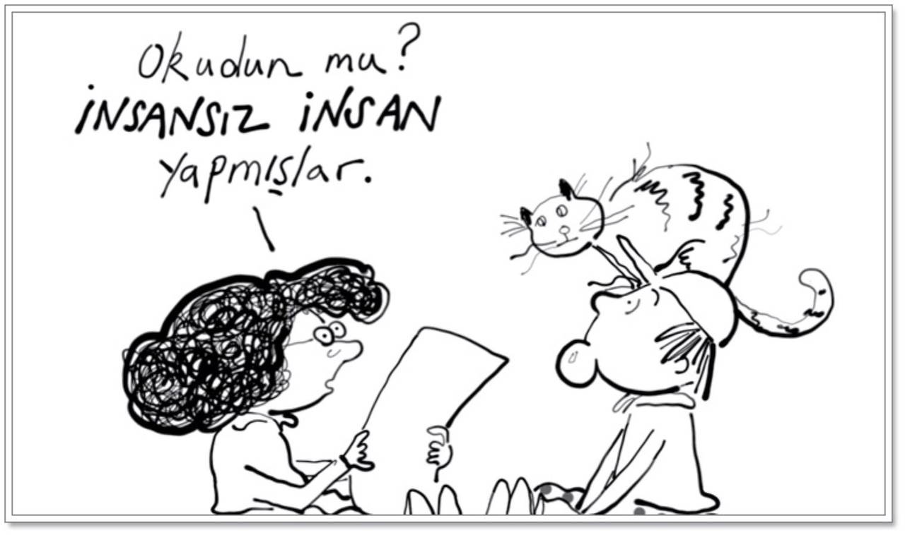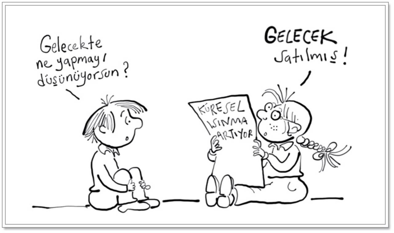 Bir başka karikatürünüzde çocuk arkadaşına şöyle diyor: “Biz dijital iletişim çağı çocuklarıyız.” Arkadaşının yanıtı ise çarpıcı: “Bence eşitsizlik, aşırı üretim, küresel ısınma, kimlikçilik, adaletsizlik ve naylon torba çağı çocuklarıyız”.