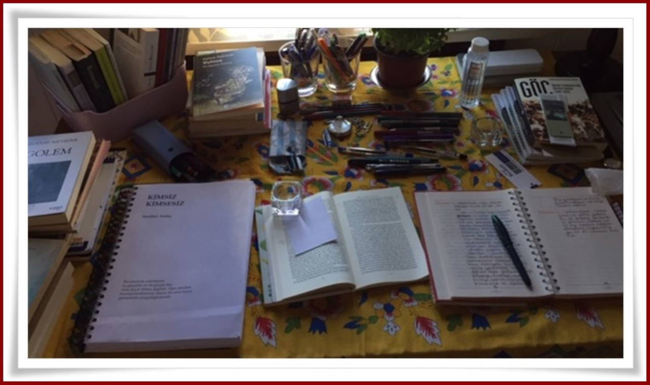 Bir taşra avukatının yazıhanesini andırıyordu. Konuştuğumuzda; “az ve uzun yazarım,” demişti. Şu ân tezgâhta ne var soruma yanıt olarak: “Tezgâh mezgâh yok, şu avukatlık dönemimden kalan masa, ara sıra yaptığım karalamalar. Bir cümle bazen birkaç günümü alır,” demişti.