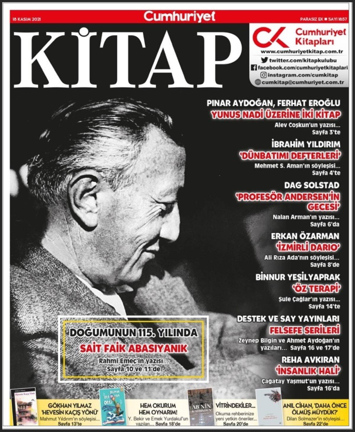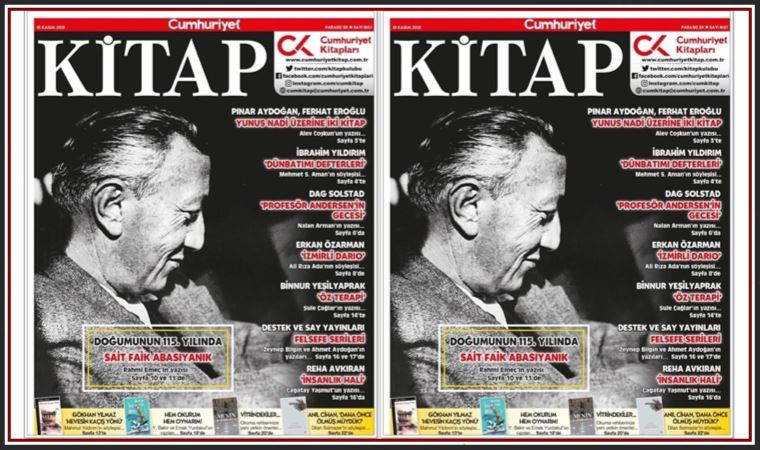 - 3. sayfamızda, gerek Cumhuriyet gazetesi gerekse Cumhuriyet gazetesinin sahibi ve başyazarı, ödün vermez Cumhuriyetçi Yunus Nadi ile ilgili kaleme alınan, Dr. Pınar Aydoğan’ın Kemalizmin Muhafazakâr Bir Yorumu - Yunus Nadi (Alfa Yayınları) ve Dr. Ferhat Eroğlu’nun Yunus Nadi (Atatürk Araştırma Merkezi) adlı kitaplarını merceğe aldığı “Kuvayı Milliyeci, Atatürkçü, Cumhuriyetçi, Aydınlanmacı...” başlıklı yazısıyla Alev Coşkun yer alıyor.