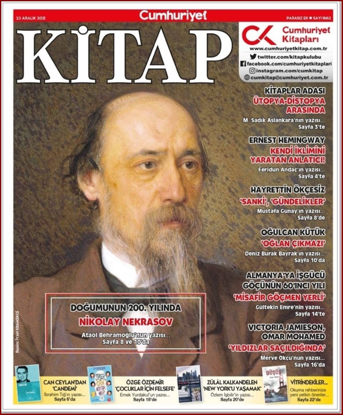 - BUGÜN yayınlanan 1662. sayımızın kapağında; lirik ya da epik toplumcu şiirleri ve özellikle de “Rus Kadınları”, “Ayaz, Kırmızı Burun”, “Rusya’da Kim İyi Yaşar?” destansı anlatı-şiirlerinin Puşkin, Gogol, Dostoyevski, Tolstoy, Gonçarov, Turgenev gibi büyük çağdaşlarının hiç de gölgesinde olamayacağı gibi, halk yaşamını edebiyata taşımada hepsinden çok daha önde olduğunu gösterdiği, doğumunun 200. yılında usta Rus şair ve yazar Nikolay Nekrasov kapağımızda. Ataol Behramoğlu’nun incelemesi...
