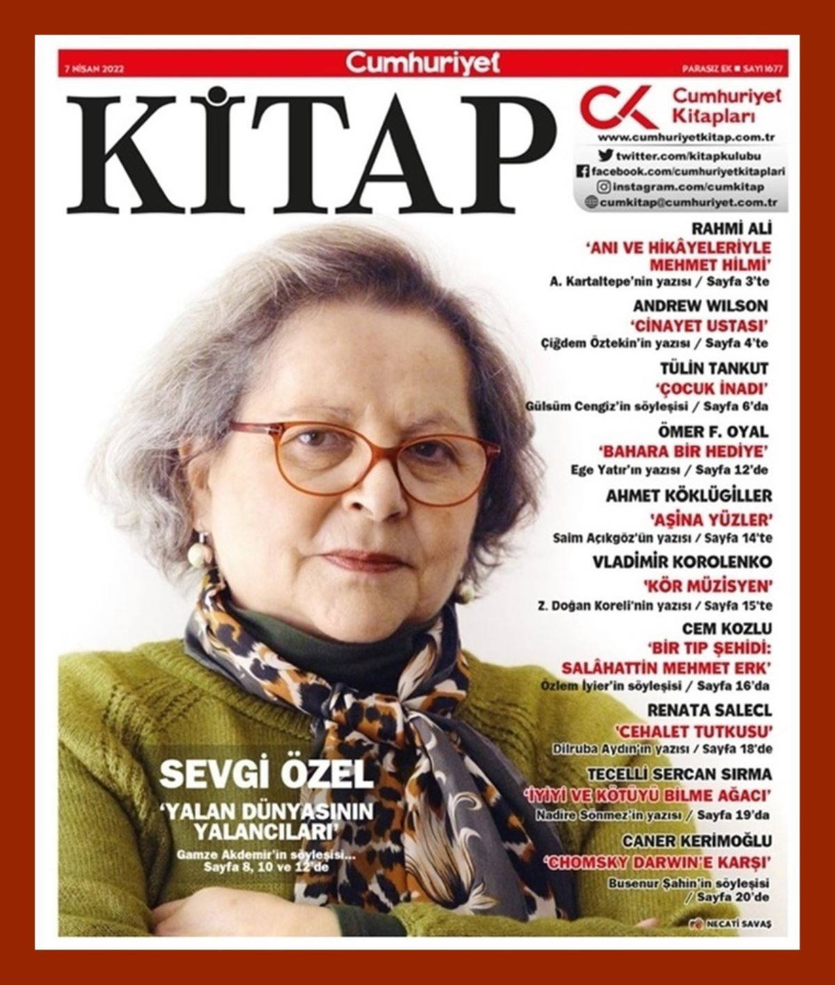 - Usta dilbilimci, aydın ve yazar Sevgi Özel, 1960’lardan bugünlere yakın tarihle iç içe geçen anılarını kaleme aldığı, Atatürk’ün kurduğu Türk Dil Kurumu’nda 12 Eylül öncesi ve sonrasında neler olduğu ve oradaki “dil emekçileri”nin neler yaşadığından Dil Derneği’nin nasıl kurulduğuna, yayıncılık deneyimlerinden Ankara’daki yazar çevresine, devrim karşıtlarıyla savaşıma, siyasi ve kültürel ortamın dünden bugüne nasıl yozlaştığına ilişkin tanıklıklarını paylaştığı, bir sözlü tarih çalışması niteliğindeki anı kitabı Yalan Dünyasının Yalancıları’yla (Kırmızı Kedi Yayınevi) kapağımızda. Gamze Akdemir’in söyleşisi...
