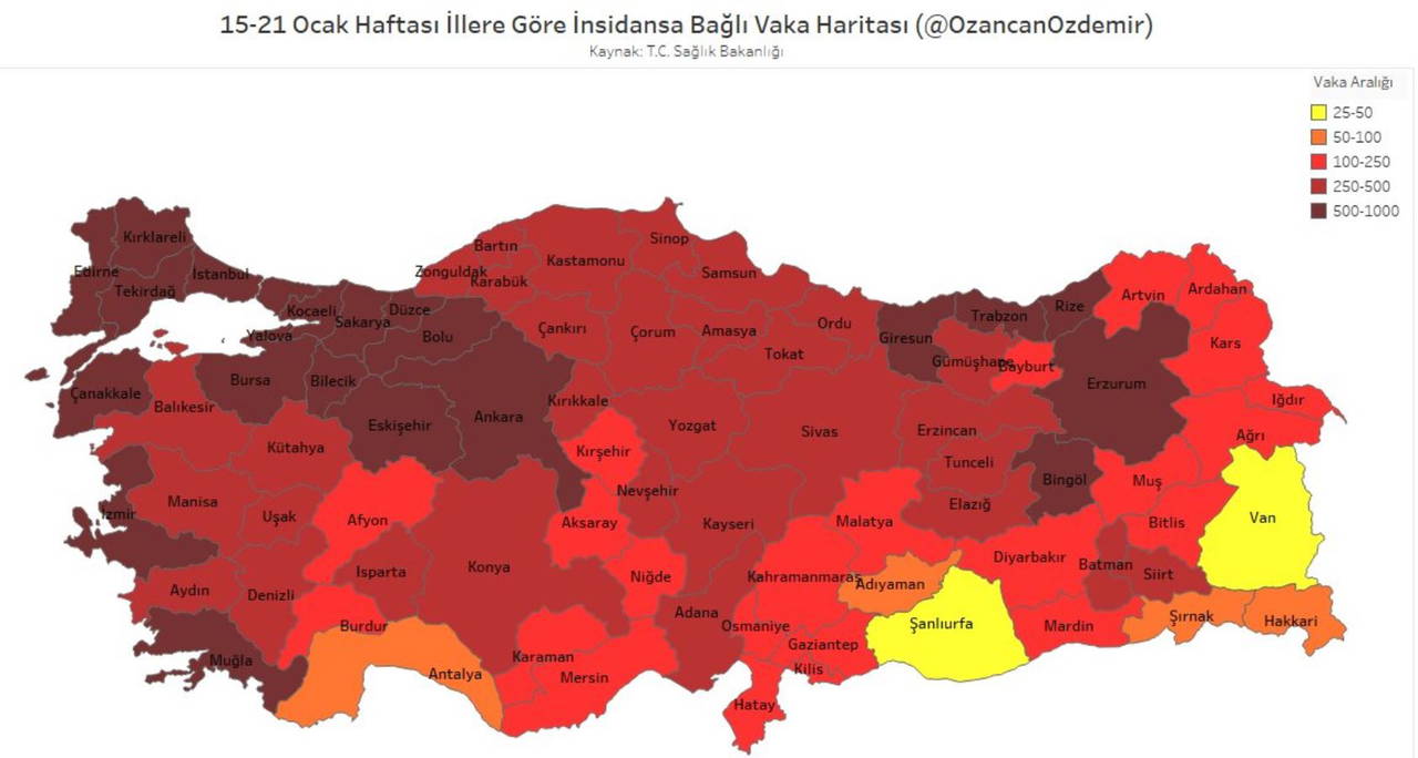 ODTÜ İstatistik bölümünde Araştırma Görevlisi Ozancan Özdemir, Sağlık Bakanlığı’nın 15-21 Ocak arasındaki koronavirüs verilerinden yararlanarak illere göre insidansa bağlı vaka haritası hazırladı.