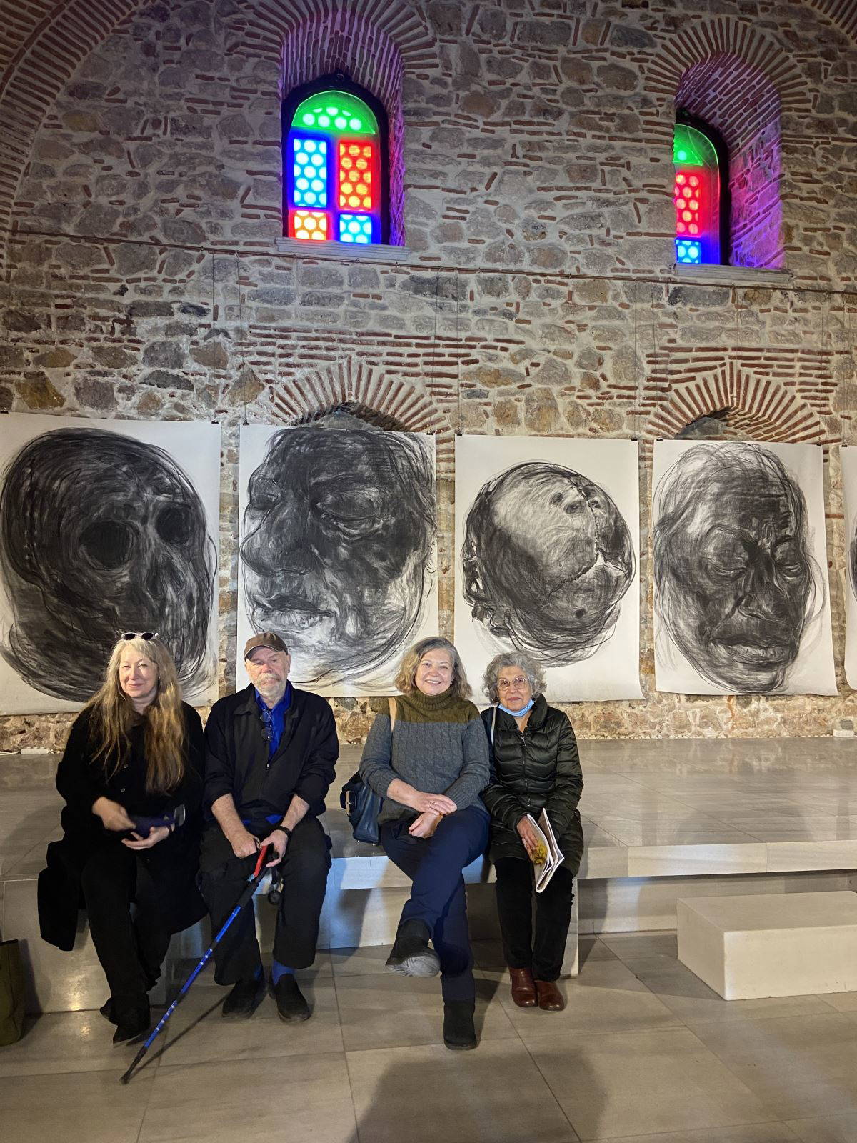 İngiliz sanatçı Anita Taylor (soldan sağa) küratör Gary Sangster, Aşıklı Höyük Dostları Derneği’nden Hayrünnisa Aligil ve Katalan sanatçı Eva Bosch Taylor’un eserinin önünde.