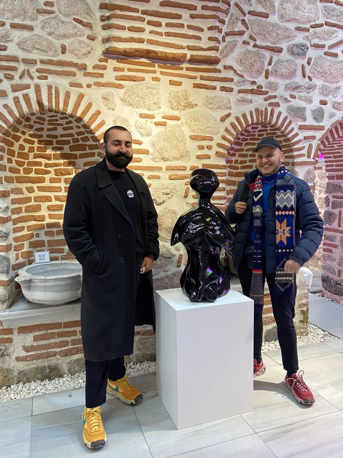 Ahmet Rüstem Ekici ve Hasan Sorar 3D tekniğiyle üretilen heykel ile.