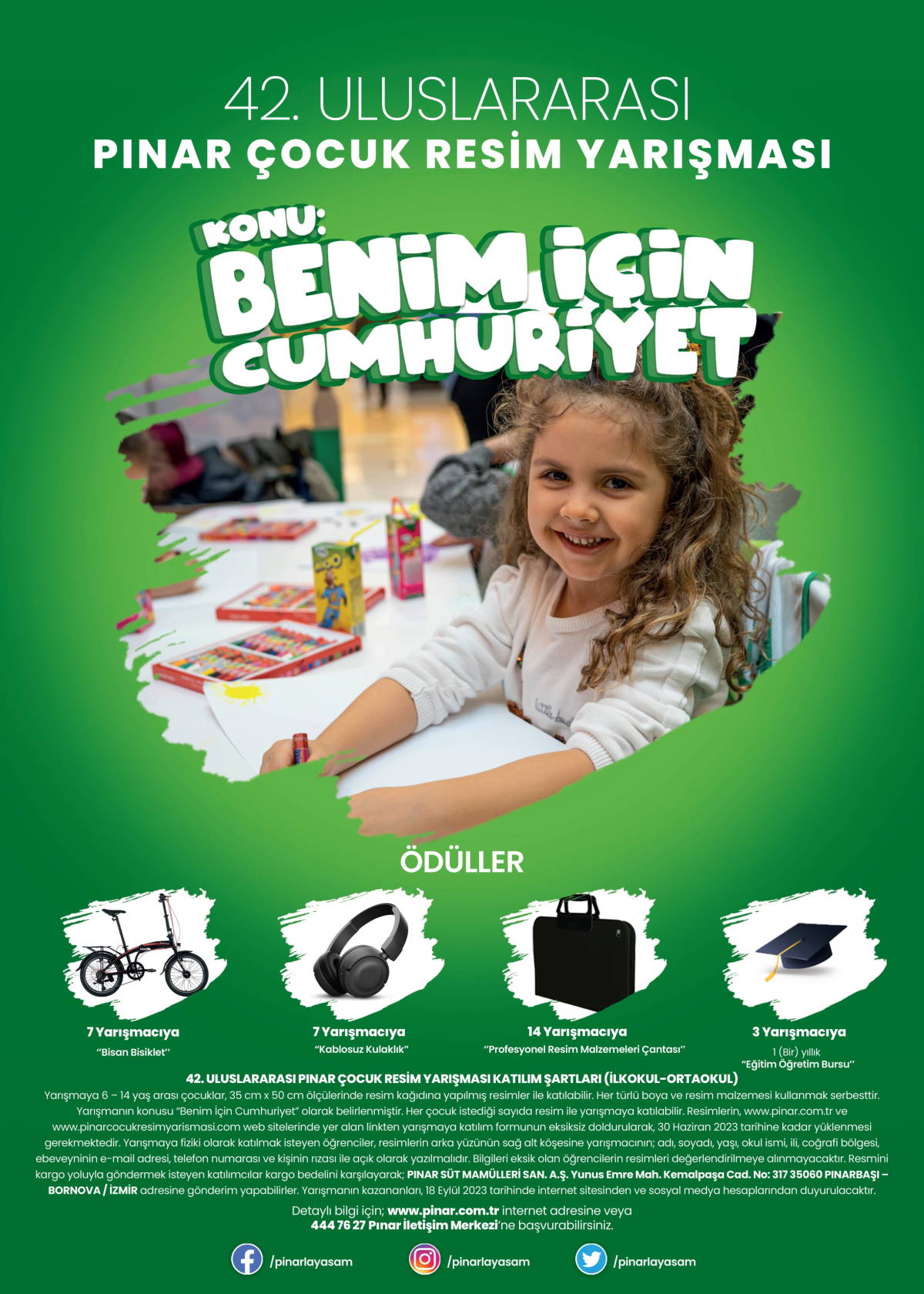 Pınar tarafından bu yıl 42.si düzenlenen ödüllü çocuk resim yarışması başladı. Çocukları, Cumhuriyet’i resmetmeye çağıran yarışma,www.pinar.com.tr ve www.pinarcocukresimyarismasi.com web siteleri üzerinden 30 Haziran 2023’e kadar başvuruları kabul edecek.