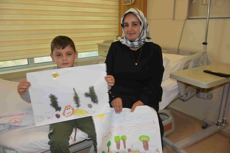 “Ömür Asaf doğuştan akciğer enfeksiyonu kaptı ve beyin bacak kaslarını yönetmiyor. Bu nedenle bir ay önce Ünye Devlet Hastanesi’nde fizik tedaviye başladık. Hastane odasında beklerken canı sıkılmaya başladı. Ona boya kalemleri ve defter aldım. Defterleri boyalamaya başlayınca resim çizmeye başladı. Bacaklarındaki rahatsızlık nedeniyle gezmeyi sevmez ama bu tedavi süreci gayet iyi gidiyor.