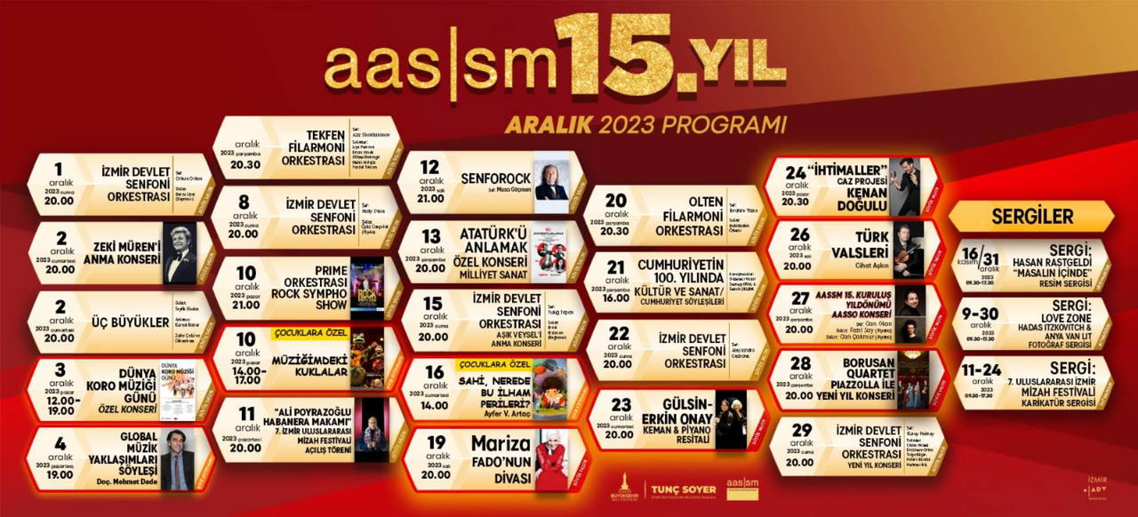 11 Aralık'ta İzmir Uluslararası Mizah Festivali açılış töreninde Ali Poyrazoğlu Habanera Makamı ile 21 Aralık'ta gazeteci yazar Zeynep Oral ve yazar Semih Çelenk ''Cumhuriyetin 100. Yılında Kültür ve Sanat'' söyleşisiyle AASSM’de yer alacak.