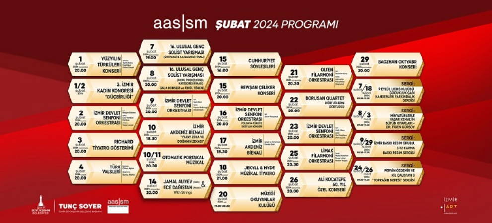 İzmir Devlet Senfoni Orkestrası konserleri, Şubat ayıda da yine her cuma AASSM'de dinleyicileriyle buluşmaya devam edecek. Konser biletleri biletinial.com adresinden satışta olacak. 7 Şubat-18 Şubat tarihleri arasında “9 Eylül Lions Kulübü Çocukluk Çağı Kanserleri Farkındalık Sergisi'' AASSM Alt Galeride, 8 Şubat-3 Mart tarihleri arasında Dr. Figen Gürsoy'un “Minyatürlerle Yaşar Kemal'in Bütün Kitapları Sergisi” AASSM Giriş Galerilerde, 8 Şubat-29 Şubat tarihleri arasında “İzmir Baskı Resim Grubu 3/12 Karma Baskı Resim Sergisi” AASSM Üst Kat Batı Galeride, 24 Şubat-26 Mart tarihleri arasında Pervin Özdemir Kil Çalıştayı ve “Toprağın Nefesi Sergisi'' AASSM Alt Galerilerde ücretsiz olarak gezilebilecek. AASSM'de Şubat ayında düzenlenecek tüm etkinliklerin ayrıntılarına ''aassm.org.tr'' adresinden ulaşılabilir.