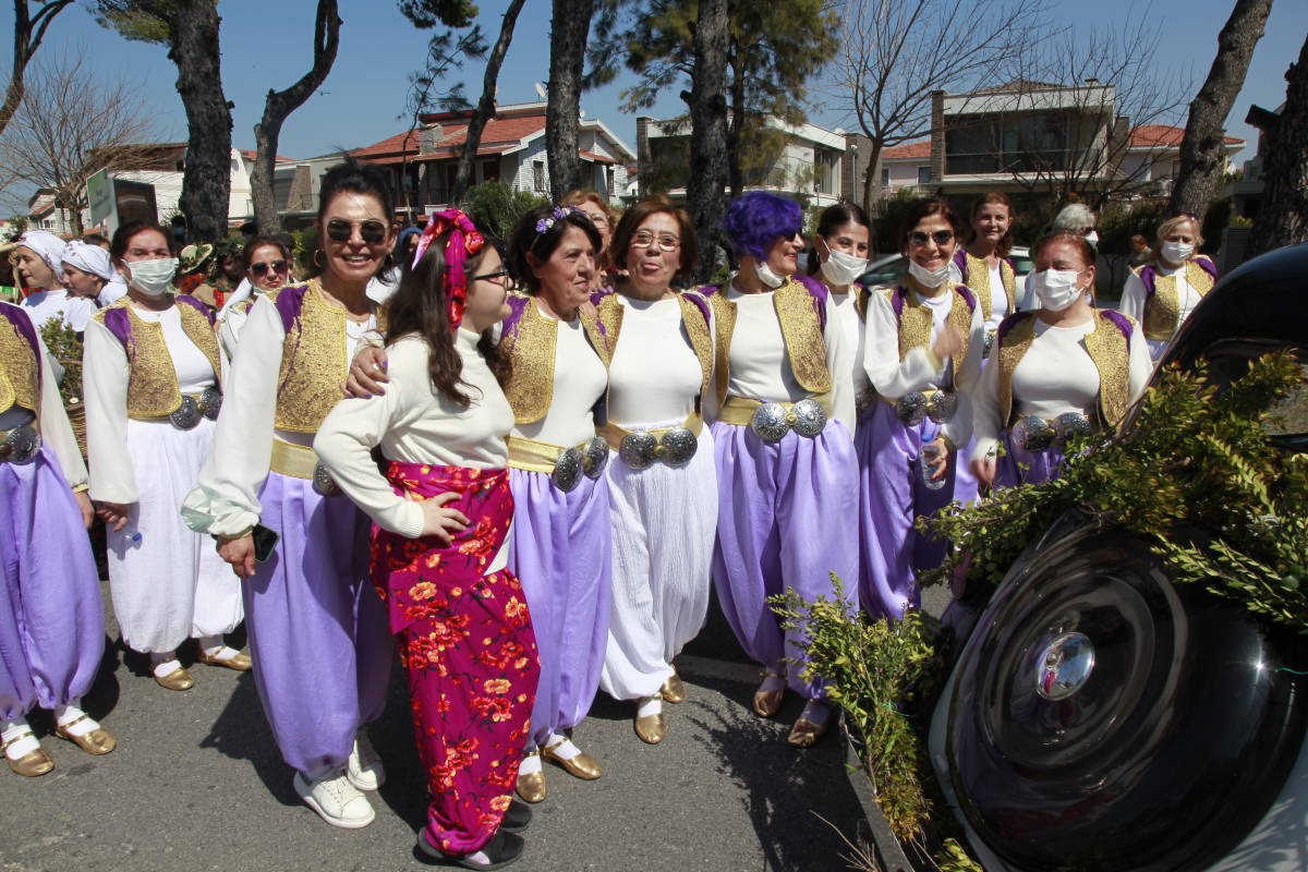 Cuma günü festival kortejini yakalıyoruz; İstanbul'dan gelen biz gazetecilerin ilk katılım gösterdiği etkinlik bu... Yaklaşık 45 dakika süren kortej geçişinde en önde sokakları şenlendiren bir bando, hemen arkasında ise başlarında çiçeklerden yaptıkları taçlar ve yerel kıyafetlerle Egeli kadınlar geliyor.