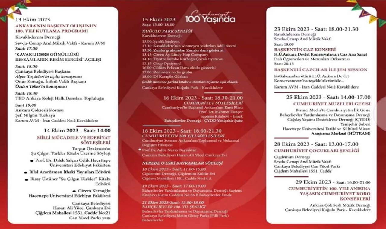 Cumhuriyetin ve Ankara'nın Başkent oluşunun 100. yılı kutlama etkinlikleri kapsamında Çankaya Belediyesi, Kavaklıderem Derneği ve Sevda-Cenap And Müzik Vakfı işbirliğiyle düzenlenen Çankaya Mahalle Şenlikleri 13 Ekim'de başlayıp 29 Ekim'e dek sürecek. Etkinlikler, Ankara'nın Başkent oluşunun 100. yılı olan 13 Ekim'de saat 17.00'de Karum Atrıum'da Kavaklıdere gönüllüsü ressamların sergi açılışıyla başlayacak. Açılışın ardından saat 18.00'da etkinliklerin onur konuğu İnönü Vakfı Başkanı Özden Toker konuşma yapacak. TED Ankara Koleji Halk Dansları Topluluğu'nun gösterisinin ardından da Sevda-Cenap And Müzik Vakfı Ankara Çoksesli Korosu sahne alacak. 14 Ekim'de de Çiğdem Mahallesi 1551. Cadde No:21 adresinde bulunan Hasan Ali Yücel Çankaya Evi'nde saat 14.00'da Milli Mücadele ve edebiyat söyleşileri başlayacak. 15 Ekim'de Kuğulu Park'ta Kavaklıderem Derneği'nin şenlikleri yapılacak.16,18 ve 19 Ekim'de Çankaya evlerinde söyleşiler düzenlenecek. 21 Ekim'de 'Bahçelievler 100. Yıl Şenliği', 23 Ekim'de konserler, 25 Ekim'de Cumhuriyet müzeleri gezisi, 28 Ekim'de 'Cumhuriyet Çocukları Şenliği', 29 Ekim'de ise Ankara Çoksesli Müzik Derneği'nin 'Yaşasın Cumhuriyet Koro konserleri' düzenlenecek.