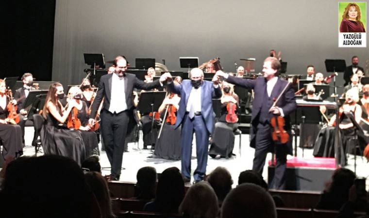 AKM’nin en büyük olan opera salonunda gerçekleştirilen konseri, besteci, keman virtüözü ve orkestra şefi Hasan Niyazi Tura yönetti; solistler Cihat Aşkın (Keman), Simge Büyükedes (Soprano), Serkan Bodur (Tenor) ve Caner Akgün (Bariton) konserin yıldızlarıydı. Konserin bir özelliği de çalınan eserlerin Türk bestecilerin olması; dahası, hayatta olan ikisinin salonda bulunmasıydı! “Kimdi onlar” derseniz, İDSO’nun temellerini atan hocaların hocası besteci Cemal Reşit Rey’den “Türkiye’den Seçkiler”; Cemal Reşit Rey’in öğrencisi, Viyana Müzik Akademisi Kompozisyon Bölüm Başkanı besteci Ertuğrul Sevsay’ın “Yunus Emre” güfteleri üzerine bestelediği şarkıların dünya prömiyeri ve orkestra şefi Hasan Niyazi Tura’nın da babası olan Yalçın Tura! Ki Ertuğrul Sevsay ve Yalçın Tura, eserlerinin seslendirilmelerinden sonra sahneye çağrılarak selamlandı, alkışlarla saygı sunuldu.