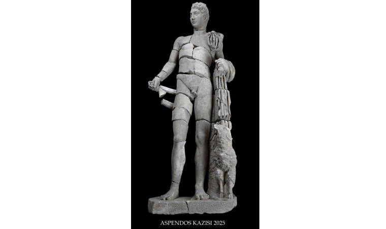 Bakanlıktan yapılan açıklamaya göre; Aspendos Antik Kenti'nde 2024 sezonunda kazılarına başlanan Tiyatro Caddesi’nin doğusunda yer alan giriş kapısının güney kanadına konumlandırılmış anıtsal çeşmenin (nymphaion) yıkıntıları arasında, mermer Hermes heykeli bulundu.
