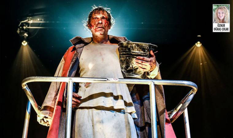 Sahnenin ortasında bir vinç, vincin üzerinde bir oyuncu... Sahnenin sağında ve solunda seyirci için koltuklar yerleştirilmiş. Eğer oyuncu seyirciye bu kadar yakınsa ve sahneye seyirci aldıysa, seyirciyi oyuna mutlaka katar.