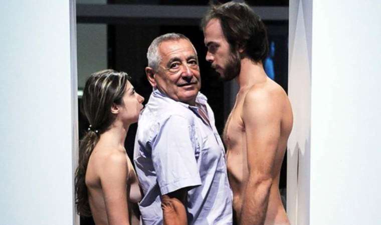 Londra'da Kraliyet Sanat Akademisi’ndeki sergiye girmek isteyenlerin iki çıplak modelin arasından geçmesi, Sırp performans sanatçısı Marina Abramovic’in retrospektif sergisinin bir parçası.