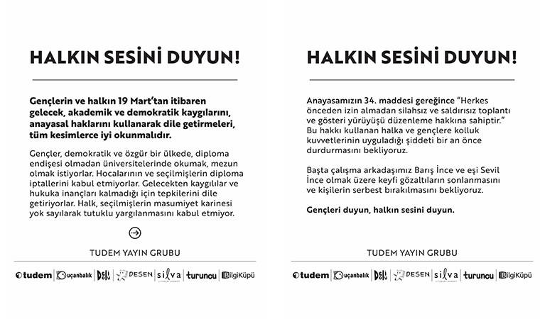 "Gençlerin ve halkın 19 Mart’tan itibaren gelecekle ilgili akademik ve demokratik kaygılarını, anayasal haklarını kullanarak dile getirmeleri, tüm kesimlerce iyi okunmalıdır. Gençler, demokratik ve özgür bir ülkede, diploma endişesi olmadan üniversitelerinde okumak ve mezun olmak istiyorlar. Hocalarının ve seçilmişlerin diploma iptallerini kabul etmiyorlar. Gelecekten kaygılılar ve hukuka inançları kalmadığı için tepkilerini dile getiriyorlar. Halk, seçilmişlerin masumiyet karinesi yok sayılarak tutuklu yargılanmasını kabul etmiyor" denildi.