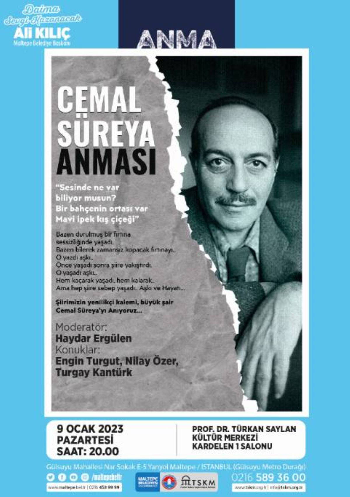 Programda ‘İkinci Yeni’ şiirinin öncü şairlerinden biri olan, şiirlerinin yanı sıra denemeler, tenkit yazıları, şiir ve düz yazı tercümeleri, çocuk kitabı, günce ve derlemelere imza atan Cemal Süreya, şiirleri ve sanatıyla anılacak. Maltepe Belediyesi Kültür ve Sosyal İşler Müdürlüğü’nce düzenlenecek program halka açık ve ücretsiz düzenlenecek. Programın davetiyeleri etkinlik tarihinden iki gün önce Prof. Dr. Türkan Saylan Kültür Merkezi gişesinden ve www.tskm.org.tr adresinden edinilebilir.