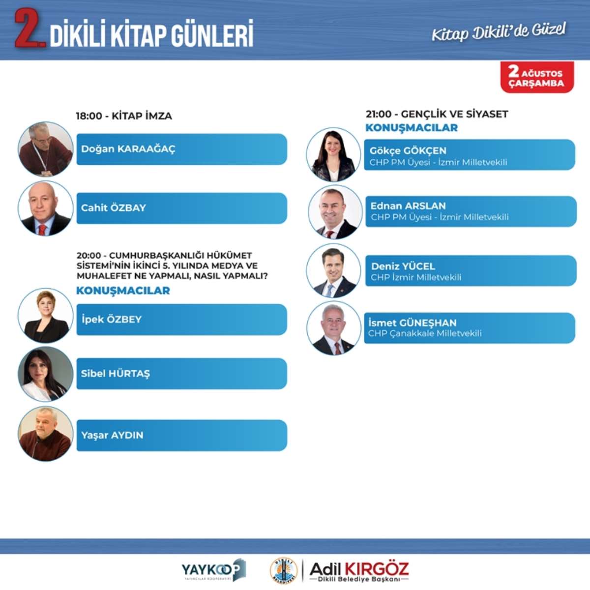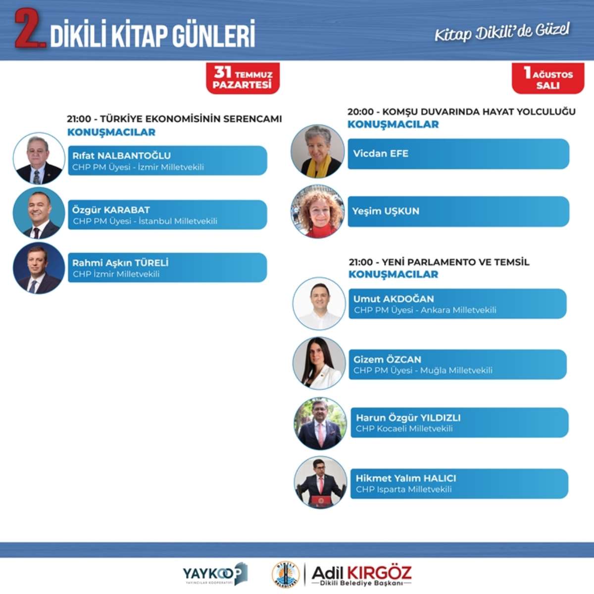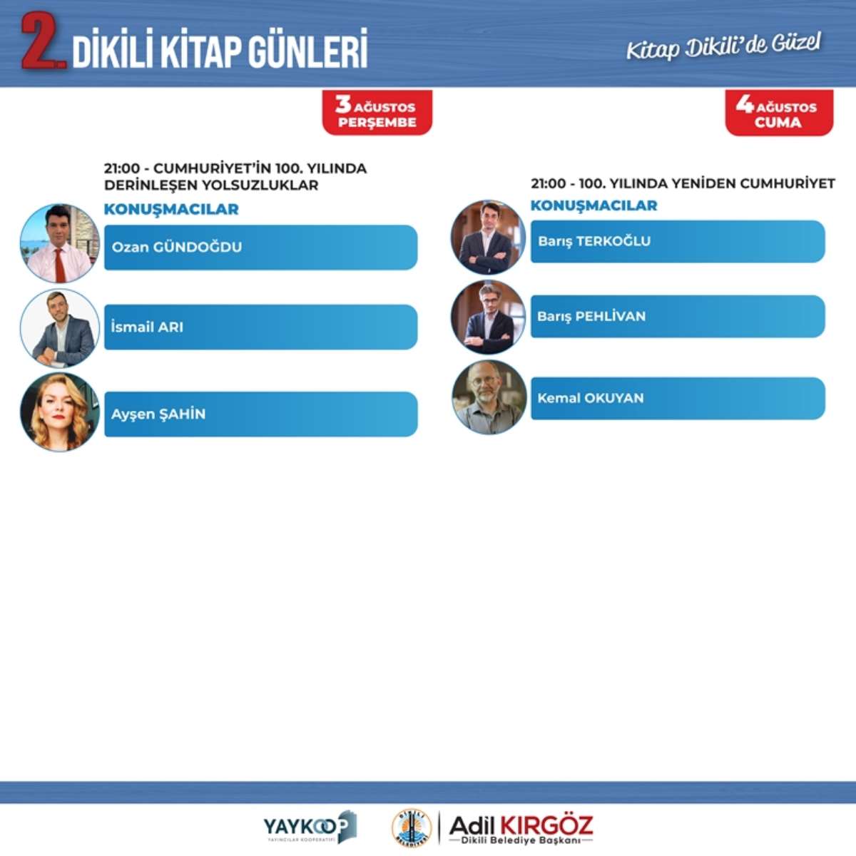 Kent tarihinde bir ilk olarak geçen yıl başlattığı Dikili Kitap Günleri’ne ikinci kez ev sahipliği yapmanın mutluluğunu yaşayan Dikili Belediye Başkanı Adil Kırgöz “Dikili Belediyesi olarak Yayıncılar Kooperatifi (YAYKOOP) iş birliği ile 29 Temmuz -6 Ağustos tarihlerinde gerçekleştireceğimiz 2. Dikili Kitap Günleri’nin temasını ‘100. Yılında Cumhuriyet’ olarak belirledik. 9 gün boyunca eşsiz günbatımı eşliğinde Dikili sokaklarında denizden gelen meltem rüzgarının iyot kokusuyla beraber kitap kokularının yayılacağı etkinliğimizde ülkemizin değerli sanatçılarını, aydınlarını, siyaset insanlarını kitapseverler ile bir araya getiriyoruz. Ulu Önderimiz Gazi Mustafa Kemal Atatürk’ün bizlere armağan ve emanet ettiği Cumhuriyetimizin 100. yılında düzenleyeceğimiz 2. Dikili Kitap Günleri’ne tüm halkımızı davet ediyoruz.” dedi.
